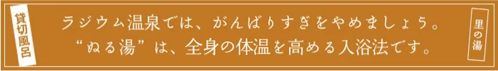 カラダを癒す38℃のぬる湯。ラジウム温泉のラドンを効率的に吸入できるよう設計された貸切風呂「里の湯」。