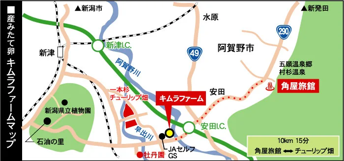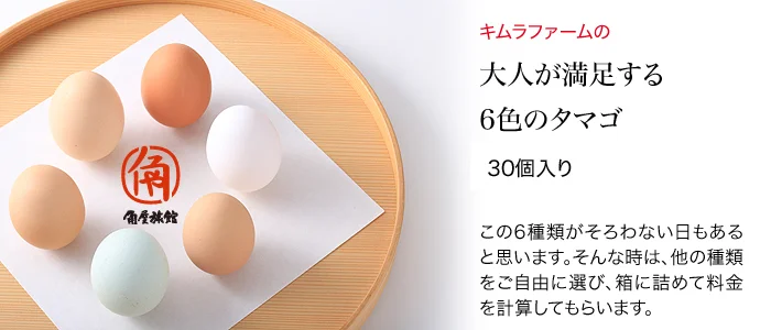 角屋旅館で使う卵は、すべて地元の養鶏場「キムラファーム」から直接届けられる新鮮で安心な、おいしい産みたて卵100%です。1万2千羽を育てる新潟県五泉市・キムラファームでは、高品質なエサを与え、衛生的・健康的な卵を生産しています。生産者が直接販売できるのは品質が高い証拠です。おかずが無い時、時間が無い時に食べることが多い「卵かけご飯」。 そんな食べ方ではもったいないくらいおいしい卵。みんなが喜ぶ、「わが家のごちそう」になるでしょう。キムラファームには、生産者の顔が見える直売所があります。赤たまご 白たまご 青たまご ピンクたまご新潟地鶏 名古屋コーチン 烏骨鶏ほかとても珍しいおいしい卵だから、お土産にすれば、とても喜ばれます。最近よく目にする「赤い卵」は、なぜ赤いのかご存知でしたか。赤い卵は、赤い(茶色)鶏が産む卵で、白い卵は、白い鶏が生む卵です。同じ鶏なのになぜ卵の殻の色が違うのか不思議ですが、色の違いは種類の違いによるものです。色々揃った新鮮で安心な、おいしい産みたての卵を、1個からでも買うことができるのはここだけ。色で選ぶか、大きさで選ぶか、値段で選ぶか。おいしい卵を楽しみながら選ぶことができます。キムラファームのおいしい産みたて卵の直売所は、阿賀野川の近くにあり、車中からも簡単に見つけることができる大きな鶏の看板とノボリが目印。春から秋にかけては、ヤギものんびりと過ごしています。7種類のタマゴと地域の収穫物などが販売されています。産みたてたまごの生産・直売キムラファーム新潟県五泉市論瀬6363TEL : 0250-43-4036 (店舗直通)■営業時間 : AM8:00〜PM6:00朝食のだし巻き玉子の味が忘れられません■埼玉県 20代女性前回は冬に泊まらせて頂きました。朝食のだし巻き玉子の味が忘れられず、いつかまた泊まりに行きたいと思っていました。今回もまたよろしくお願いします。すごくおいしくて妻共々もっと食べたいと思ったものですから。■新潟県 30代男性今回は、両親がお世話になります。コシヒカリの焼酎1本と、朝食の際に、だし巻きを1本つけて下さい。以前、私がお邪魔した際は、すごく美味しくて妻共々もっと食べたいと思ったものですから。どうぞ、宜しくお願い致します。このおいしい卵を味わうなら、だし巻きたまごが一番です朝食のだし巻き玉子は2切れだけです朝ごはんで人気のだし巻きたまご。2切れだけではもの足りない方や、夕食の時も食べたいくらいの玉子好きの人に、特別に1本丸ごと焼いて差し上げましょう。もちろん、使う卵は新鮮で安心なキムラファームの産みたて卵です。だし巻きたまご800円お電話でもお気軽にご予約下さい。