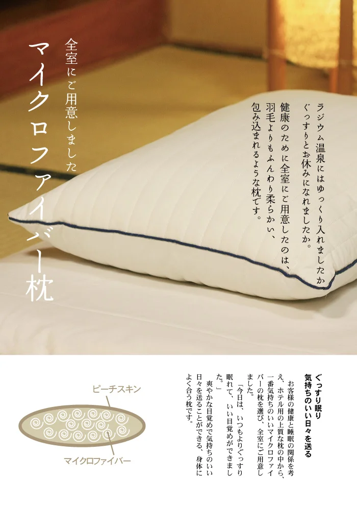 羽毛よりも柔らかく、包み込んでくれる新しい枕を全室にご用意いたしました。お客様の健康を考え、ラジウム温泉に浸かった後にぐっすり眠ることができる最高の枕を探すために、私たちは3ヶ月間を費やしました。