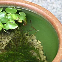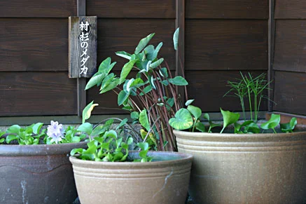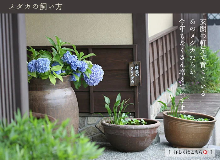 * * * クロメダカの飼い方 増やし方 * * *メダカの住む里山メダカの飼い方冬のメダカの飼い方簡単な増やし方メダカを愛する人にメダカの猫対策角屋旅館では、玄関の軒先でメダカを飼っています。野生の村杉のメダカです。ご存知でしょうか、昔は田んぼ・用水路・小川、それに続くため池など、いろいろな場所にメダカが泳いでいました。唄の歌詞のように「メダカの学校」の姿をよく目にしたものです。宿を訪れる人々から、「ああ、懐かしい。メダカを見たの、久しぶりね。」という声をいただきます。褐色のメダカは野生の証懐かしい形の金魚鉢を気持ち良さそうに泳ぐもう、ずいぶん前から、メダカを取り巻く日本の環境が変わってしまいました。水田が乾田化し、小川が護岸され、住む場所が減ってしまい、日本全体では、もう、見つけることのできない県もあるそうです。メダカの減少は、水質によるものではなく、住む場所が少なくなったことが一番の理由です。環境省では、日本の絶滅のおそれのある野生生物の種についてそれらの生息状況等を取りまとめた「レッドデータブック」を作成しています。その中で、メダカは「絶滅危惧II類」(絶滅の危険が増大している種)として掲載されています。角屋旅館の田んぼから、霊峰五頭山を望む清流で育てる、角屋旅館の特別栽培コシヒカリメダカにとって必要な自然環境は、人間にとっても大切なはず。この土地のキレイな水のシンボルともいえるメダカを守ることが、かけがえのない里山の自然を未来に残すことと私たちは考えます。三つの睡蓮鉢を覗けば、大きさの違うメダカを見ることができます村杉の池に住むメダカを、知っていただきたくて、軒先で大切に飼っています。メダカの飼い方今年の5月に、17匹のメダカを池からすくって来ました。【産卵】10日後から睡蓮鉢の中の水草に産卵を始めました。毎朝、水草に付いた直径1ミリの卵を探し、親メダカとは別の睡蓮鉢に移し変えます。産卵したまま放置すると、親メダカが食べてしまうので、メダカが増えることはありません。【ふ化】移した卵は、2週間前後で次々とふ化します。よく観察すると、5ミリほどの稚魚が水面近くを泳いでいるのがわかるはずです。【エサ】親メダカには、1日3回乾燥ミジンコを少量ずつ与えます。水質を悪化させないように、すぐに食べきれる量にして、回数を多くすることが大切です。生まれたての稚魚は、10日後から粉末状の稚魚用のエサを与えます。【夏場の水温】野生ですので、親メダカは水温が上がっても平気ですが、生まれたての稚魚は、水温変化に弱く、夏場の直射日光による高水温は危険ですので、日陰になるようにします。睡蓮鉢の中を泳ぐ野生のメダカメダカの口は、水面のエサが食べやすいように一番上にありますかなり「受け口」ですね。8月にはホテイ草に薄青色の花が咲く水草に付いているメダカの卵。直径は約1ミリ程で、まるでカズノコの1粒にそっくり無事越冬を果たしたメダカたちに、今年は懐かしい場所を用意しました。昔の水田は、一年中田んぼに水があり、メダカやドジョウが自由に泳ぎまわっていました。そこで、5月の田植えの時に角屋農園の水田に植えたコシヒカリの稲を、玄関軒下のメダカの睡蓮鉢にも植えてみました。あれから40日。小さかった苗も順調に育ち、稲の間をクロメダカたちが機敏に泳ぐ姿を楽しむことができるようになりました。今年は玄関前でも稲刈りができるかもしれません。ご宿泊の際には、コシヒカリの成長とメダカの姿を眺める楽しみが増えました。