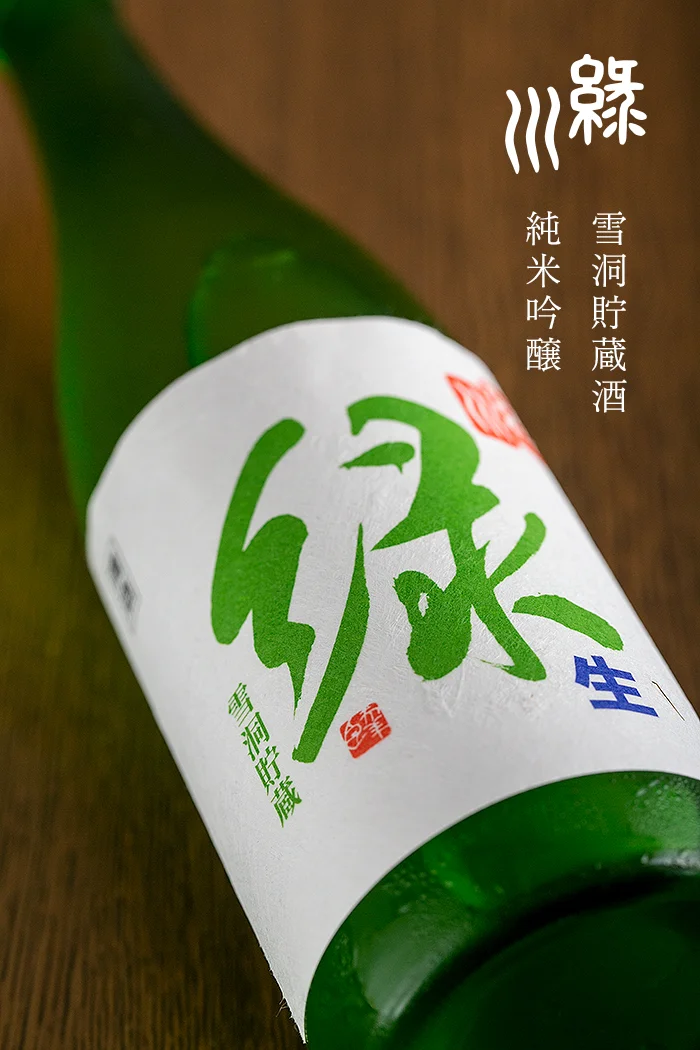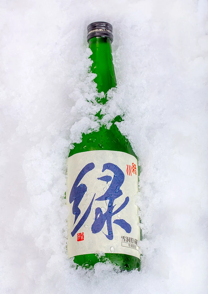 雪洞貯蔵酒 緑は、約0℃の雪洞で貯蔵し、ゆっくり静かに熟成された純米吟醸酒です。5月発売の生酒よりマイルドになり、夏に味わうのがぴったりです。夏に合う味わいです。