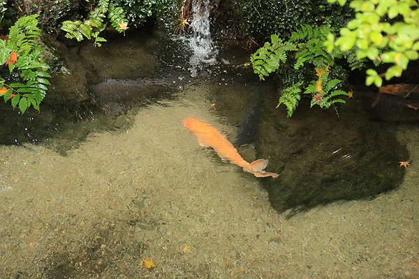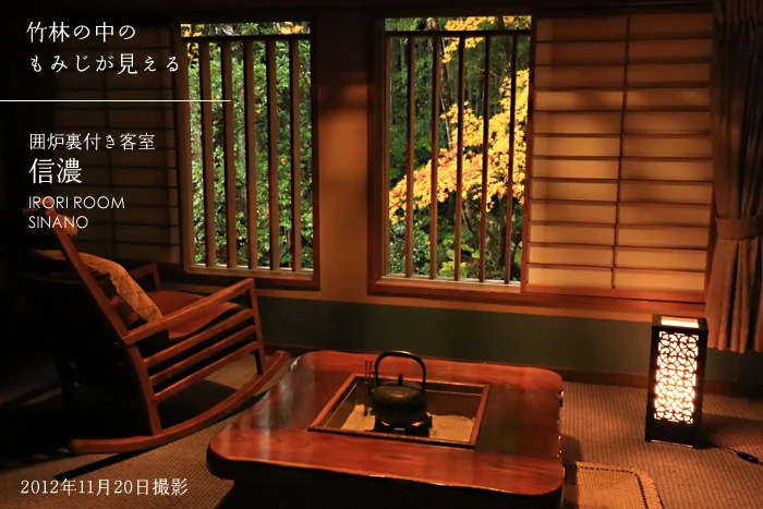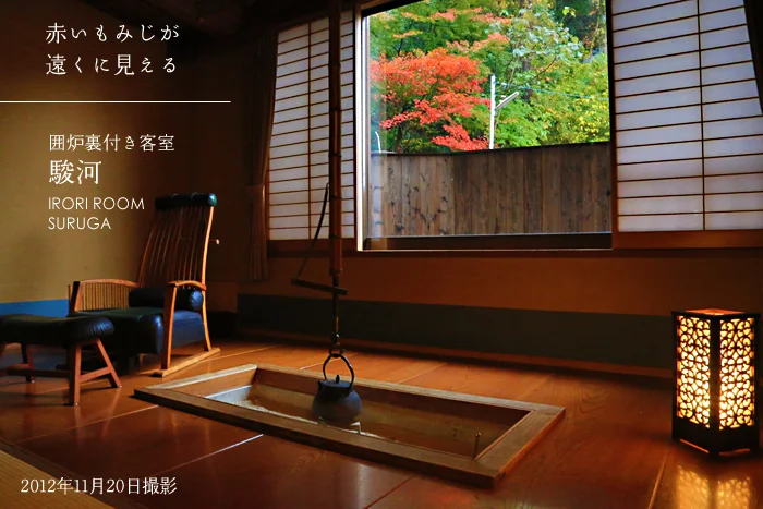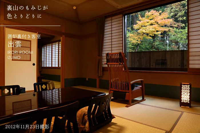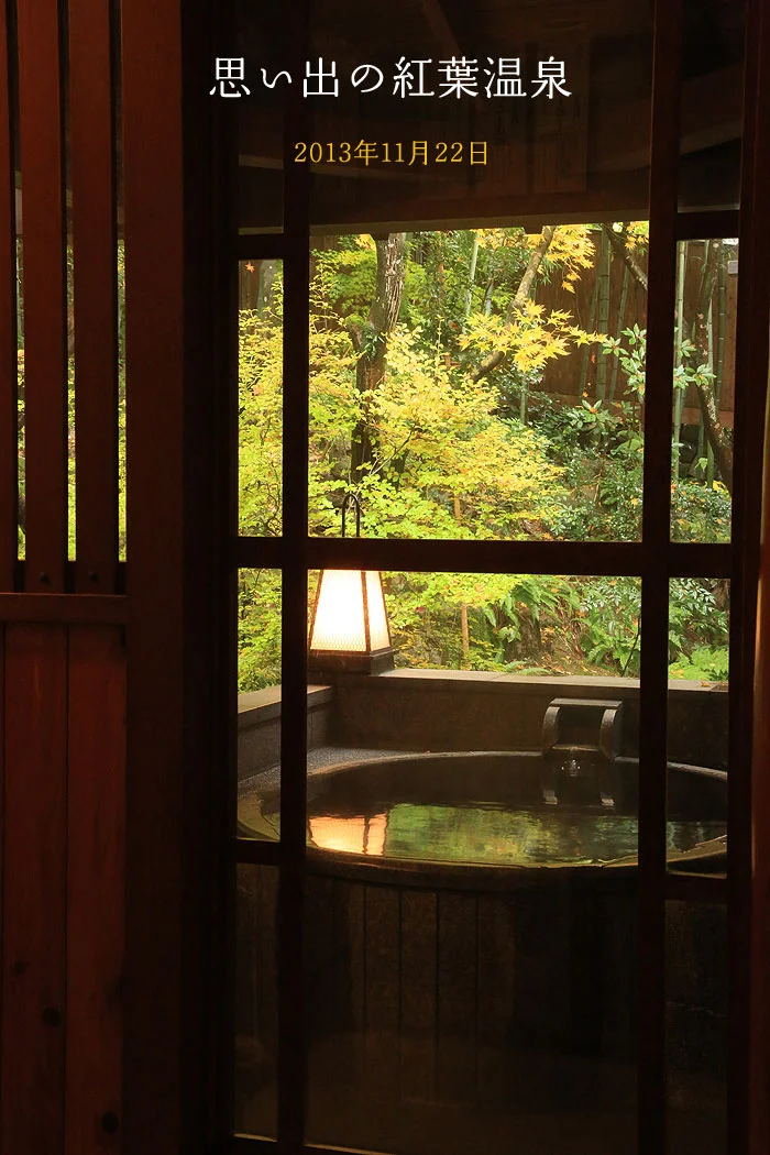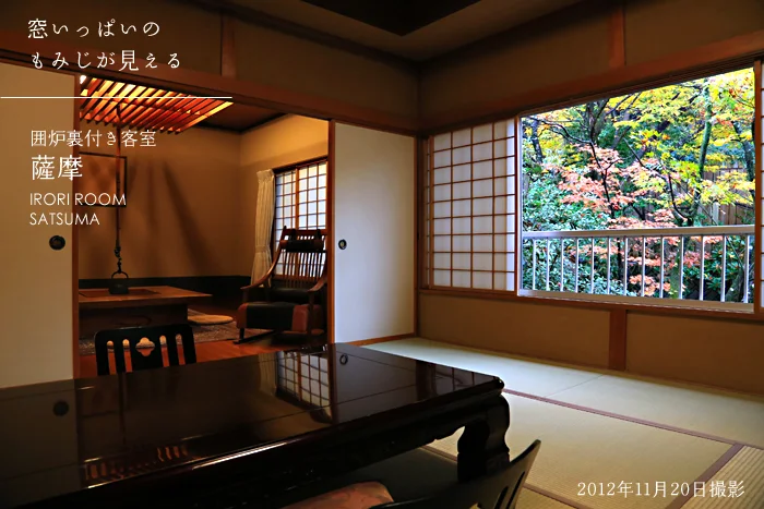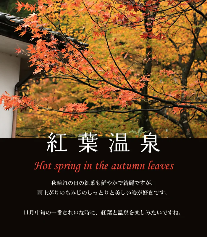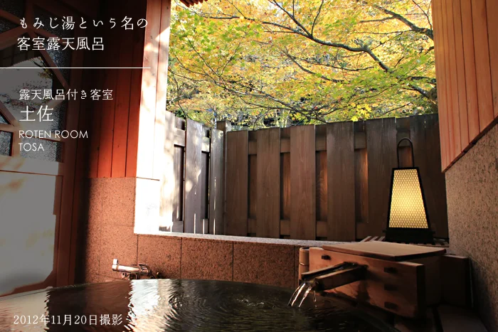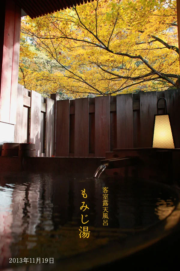 露天風呂に入るとこの景色を楽しめます。2つの貸切露天風呂から見える、もみじの古木。今年はまれに見る美しさでした。温泉に入りながら、きれいな紅葉が楽しめて良かったですね。お風呂場の池の鯉も、なんだかモミジ色に見えてきました。この紅葉を楽しむためだけに、この部屋の一番いい場所に露天風呂を作りました。だから、お風呂の名前は「もみじ湯」にしました。