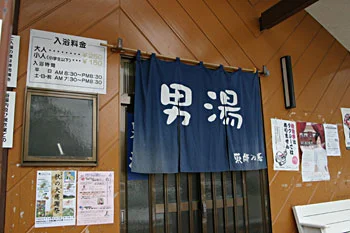 村杉温泉の真ん中に立つ共同浴場は、観光客向けというよりは地元の人々の社交場の様子。風呂上りに屋外のベンチで休み、行商の八百屋の人と話しながら涼む人の姿を眺めながら、入り口の券売機で250円の入湯券を購入して、男女別ののれんをくぐる。中にはすぐに番台さんが居るので、いま買った入湯券を渡してッ脱衣場へ。