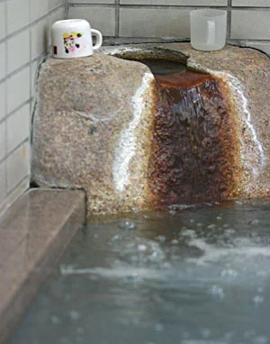 浴室は男女とも天井の高く、ゆったりと手足を伸ばすことができる深めの浴槽。お湯の温度は、角屋旅館の温泉よりも少し熱めの約42〜43℃。