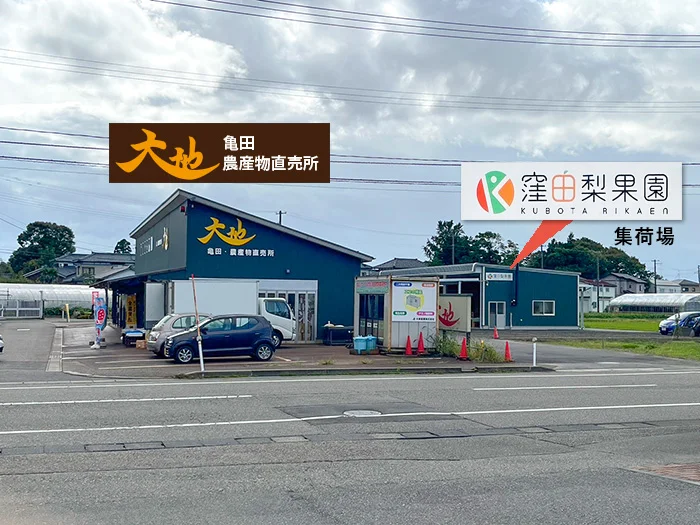 新潟市江南区茅野山にある窪田梨果園さんで梨を買うには、新潟市亀田総合体育館を目指して行きましょう。南側の駐車場の出入り口の向かいに、農産物直売所「大地」と窪田梨果園さんの「集荷場」があります。