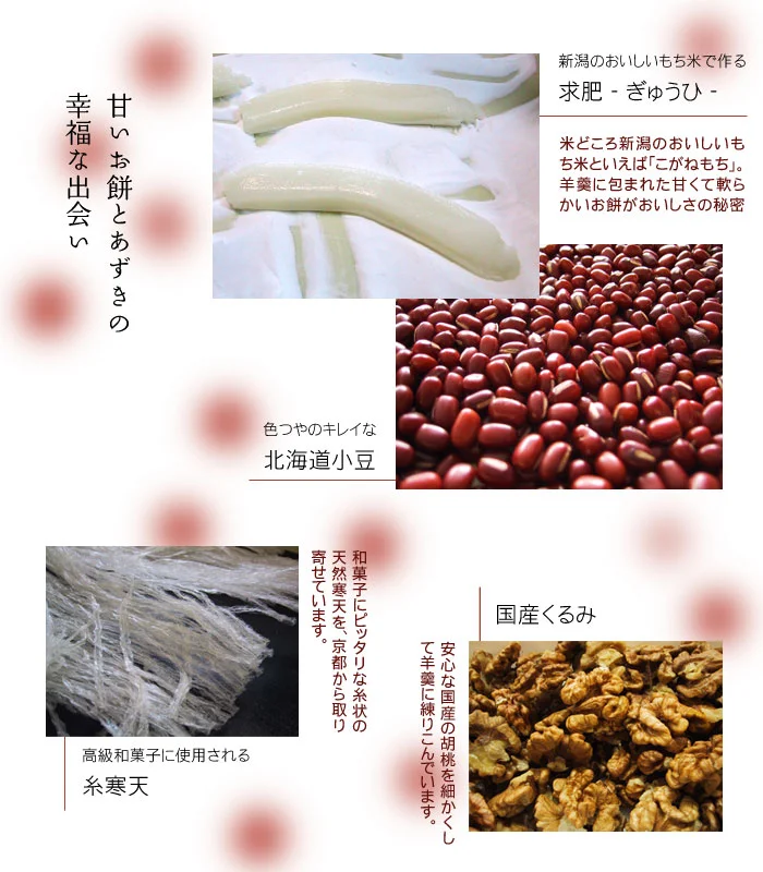 ・・・・・・・・・・・・・・・・・・・・・・・・・・・・・・・・・・・・命名は、俳優 原田大二郎 さん指導は、億万両本舗和作 山田強 氏テレビ朝日のスタッフにご協力いただき、TVチャンピオン400回記念「和菓子職人チャンピオン大会」で優勝した和菓子職人の指導を受け、新潟のもち米を生かした極上の和菓子ができました。