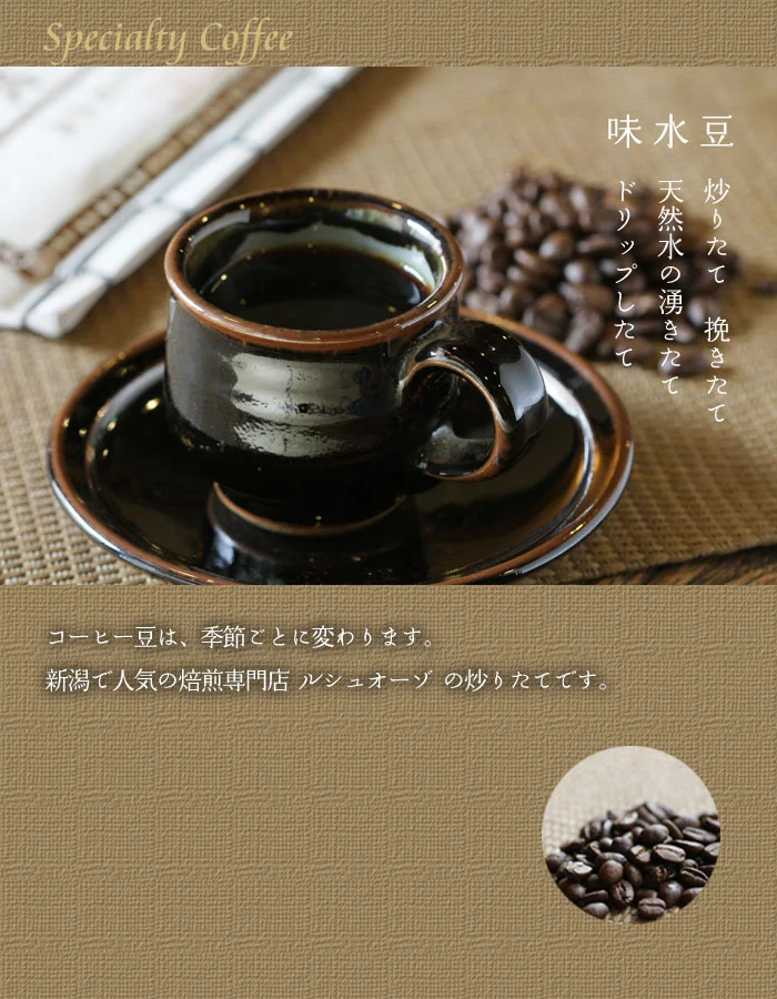 お料理が四季折々に変わるように、コーヒーも季節ごとに種類を変えています。ご注文をいただいてからコーヒー豆を挽き、名水を汲みドリップしますので、少しお時間をいただいております。湧きたての天然水で、挽き立ての豆をドリップした、出来立てのスペシャルティ-コーヒーは、ここでしか味わうことのできない味になります。