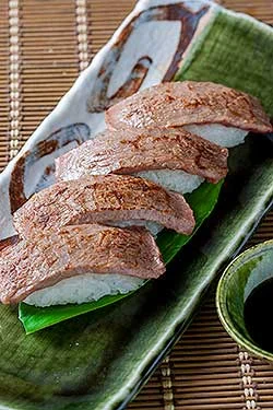 霜降り和牛炙りにぎり鮨ただいま 一貫 増量中四貫2,200円 (税込)お電話でもお気軽にご予約下さい。当日ご注文いただくこともできますご夫婦でけんかにならないように、4貫に増量しました。黒毛和牛の霜降りサーロイン部分を使う 【和牛のにぎり鮨】 を始めたのは、もう10年以上昔のことです。皆様からたくさんのご注文をいただいた人気商品ですが、時々、ご夫婦様から 「料金を割り増しして、霜降り和牛のにぎり鮨を、4貫にしてもらえませんか?」 というご要望がありその都度、4貫 2,100円でご提供しておりました。角屋旅館では、団体様はご遠慮いただいており、お客様の90%はご夫婦様です。そんな、皆様のためには、やはり、3貫ではなく4貫が理想と判断して、現在、料金そのままで、4貫に変更しています。ご夫婦で仲良く楽しむことができます。お客様の喜びは、私たちの喜びです。