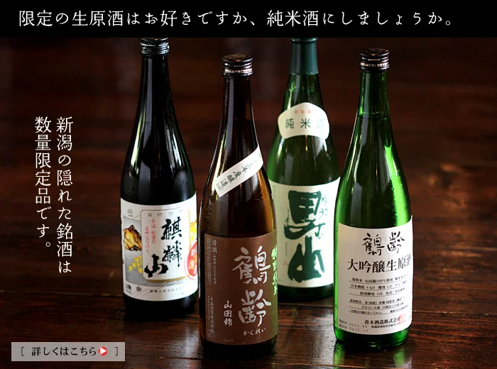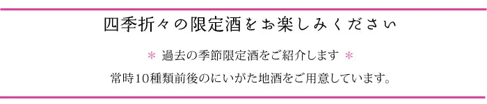 にいがたの日本酒の中から、王道の銘酒、新しい日本酒、 期間限定酒、リニューアルの日本酒を中心に、四季折々の超レアなにいがたのお酒までご用意しています。