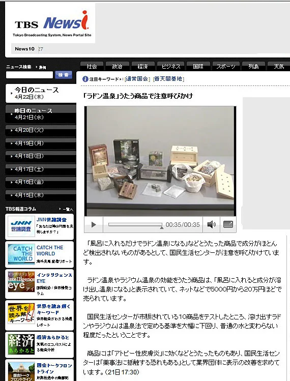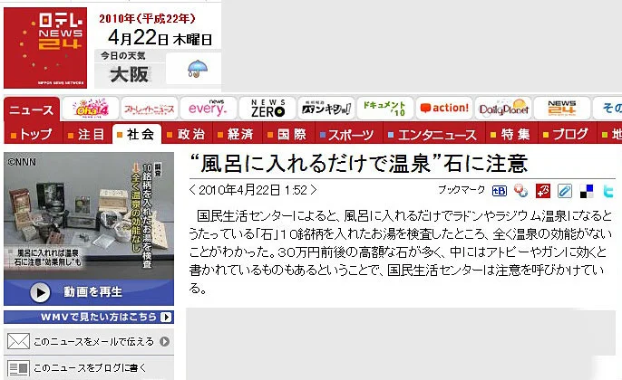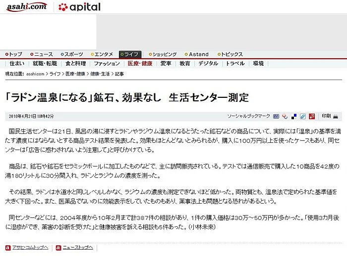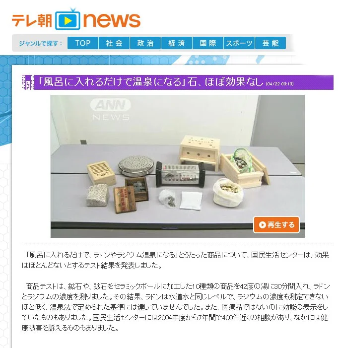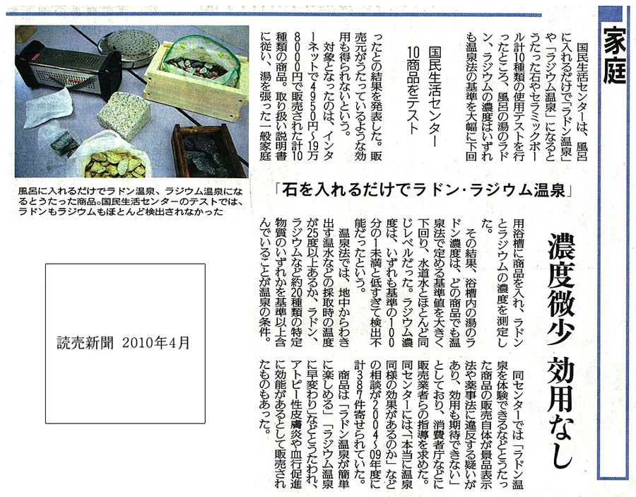 インターネット、新聞広告などで販売されている「ラジウム温泉になると謳った鉱石」について