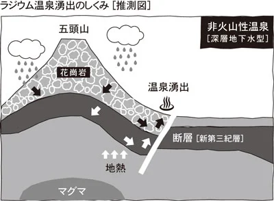 放射能泉(ラジウム温泉)は非火山性の深層地下水です。地下水がウラン・トリウム含有量の多い五頭山の花崗岩の岩盤の細かい割れ目を通過してくると、ラジウム等の放射性元素を多く含むのです。そして、その地下水が地熱を吸収して地上へ向かって上昇します。