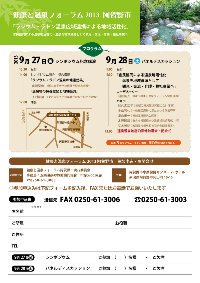 クリックして大きくする >>健康と温泉フォーラム2013阿賀野市「ラジウム・ラドン温泉広域連携による地域活性化」官民協同による温泉地活性化―温泉を地域資源として観光・交流・介護・福祉事業へ◆期日 2013年9月27日(金)―28日(土)全国の温泉地では、地域社会の疲弊と、健康に対する社会的関心の高まりの中で、温泉資源の新たな活用に向けた様々な試みが行われています。中でも、全国有数のラジウム・ラドン温泉をもつ秋田県仙北市(玉川温泉)、山梨県北杜市(増富温泉)、鳥取県三朝町(三朝温泉)、鳥取県倉吉市(関金温泉)、そして開催地新潟県阿賀野市(五頭温泉郷)は2008年より、域内の温泉資源の活用による地域活性化の取り組みや、広域連携によって相互に補完できうる有機的なネットワーク化、そして観光から健康づくり、介護福祉事業へと新たな温泉の可能性を探ってまいりました。本年の健康と温泉フォーラムではその成果を踏まえ、連携自治体の首長による調印式や、官民が一体となって取り組む地域主体の政策形成のありかたを提示することにより、産官学協同による地域活性化の具体的な取り組みのモデルとして、連携温泉地のみならず全国の温泉地の活性化にひとつの方向性を提示し、行政、旅館組合、大学などの温泉関係者の皆様と一緒にこれらの情報を共有したいと念じております。皆様のご参加を心からお待ち致しております。クリックして大きくする >>