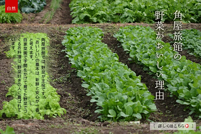 とれたての新鮮・完熟野菜を食べていただきたくて、自家農園で野菜を作っています。 自慢の有機堆肥「ゆうきの子」を使って毎年の土作りをしていますので、野菜の甘味が際立ちます。朝採りの野菜の旨みを知ってしまうと、もう、昨日の野菜は食べたくなくなります。自家農園だけですべてをまかなう事はできませんが、村杉温泉の「うららの森」の野菜の朝市にも、たくさんの野菜が並びますので、週3回の市場の開催日は、調理長が自ら買いに行くのです。
