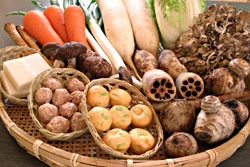 正月元旦に全国生中継で発表された名物鍋。あの服部幸應校長とフレンチの鉄人石鍋裕シェフが創作したもので、その技と味を角屋旅館の太田調理長が再現。豆乳ベースのスープに新鮮野菜がたっぷり。なんといっても、豆腐から作る飛龍頭(ひりょうづ)が面白いです。そのヘルシーな味わいが、女性の皆さんから特に喜ばれています。