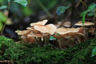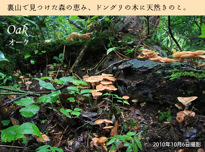 春は山菜、秋はキノコ、山芋・・・五頭山の恵み角屋旅館の料理人は、五頭山の自然の恵みを、今でも大切に、ありがたく調理します。天然のなめこはとても傷みやすいので、採ってからすぐにお客様のお料理に使わなければなりません。その日の天気で収穫量も違うため、いつも必ず食べていただくことができる物ではありません。 だからこそ天然物なのです。■時期 : 10月〜11月頃ナラタケ英語で OAK オーク とは、樫の木を意味し、ドングリの木のことでもあります。このドングリの倒木に生えていたのは、この地域では「カワギノコ」とも呼ばれる「ナラタケ」です。まるで童話の世界のように小人になった気分で、地面に寝そべってみると、大小さまざまなきのこが群生している様子がよくわかります。