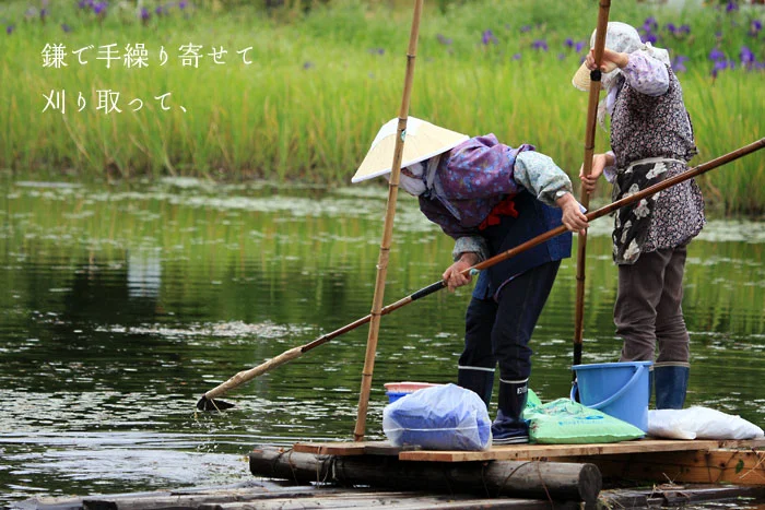 池の上半分は山からの清水が冷たすぎてあまり育たないため、手前半分くらいまでを採るのに、一週間ほど女性たちが作業をします。