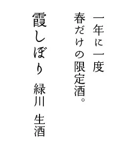 うっすらと霞がかかったような色です一年に一度だけ。新潟県魚沼市の酒蔵「緑川」からの春の限定酒「霞しぼり」です。よく冷やした生酒は、濃厚な感触とふわっと広がるフレッシュで濃密な香りが特徴です。外がかりっとして中は柔らかい地魚のから揚げや、霜降り和牛のステーキなど、油を使った料理に合わせると、油のキレがよく、後にピュアな甘さを感じさせます。希少な酒米「北陸12号」で醸し、澱(おり)を絡めたまま瓶詰めしています。うっすらと霞広がる“春を待つ”今だけの限定酒で、幸せなひと時をお楽しみください。緑川 霞しぼり 生緑川酒造株式会社◆新潟県魚沼市青島4015-1電話 : 025-792-2117緑川酒造の地図を拡大する緑川酒造株式会社新潟県魚沼市青島4015-1電話 : 025-792-2117