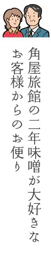 お宿でいただいたお味噌に懐かしさを覚えました。■新潟県 女性そろそろ桜は、ほころびかけた頃でしょうか。昨日は貴重な二年味噌を送っていただき誠にありがとうございました。ずっしりとした重さに、当分楽しむことができるとうれしくなりました。3月に初めて宿泊させていただき、心よりくつろぐことができました。手術創があるため、温泉に行っても大浴場は苦手としてきましたので、個室のお風呂に初めて出会って感動し、ゆっくりと心行くまで3回も入浴しました。退職してからは、毎年自分でお味噌を造っておりましたが、病気をしてからは心身ともに、億劫になってしまいました。お宿でいただいたお味噌に懐かしさを覚え、無理なお願いをしてしまいました。快く応じてくださったことを心より御礼申し上げます。ありがとうございました。またいつか、宿泊させていただける日を楽しみに・・・。農家に生まれて80年以上、新潟コシヒカリを食べてきた父が、米がうまい!味噌がうまい!こんなにほめたのは、初めて。■新潟県 50代 女性素晴らしい旅館でした!リピーターがいるのは、当然でしょう。揺るぎない経営理念と、サービス業の真髄がそこにありました。農家に生まれて80年以上、新潟コシヒカリを食べてきた父が、米がうまい!味噌がうまい!こんなにほめたのは、初めて。全ての料理の素材がいきていて、丁寧に作られ感激しました。両親の喜ぶ顔を見て、厨房で働いておられるスタッフの皆さんに、直々お会いしてお礼をいいたい気持ちになりました。お風呂も、足腰の弱っている母にとって、自分のペースで、気を使わないでゆったりと入れて大感激しておりました。80歳を過ぎている両親が、朝食をいただきながら、こんなに幸せなことはないね〜と・・・角屋さんにめぐり会えてよかったぁまた行きたい! 私もリピーターの一人になりそうです。枕が欲しかったのですが、完売となっていました。入荷の予定はあるのでしょうか?送っていただくことは可能ですか?