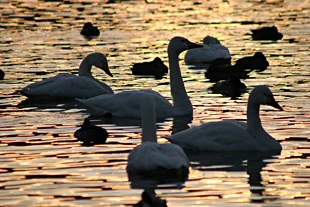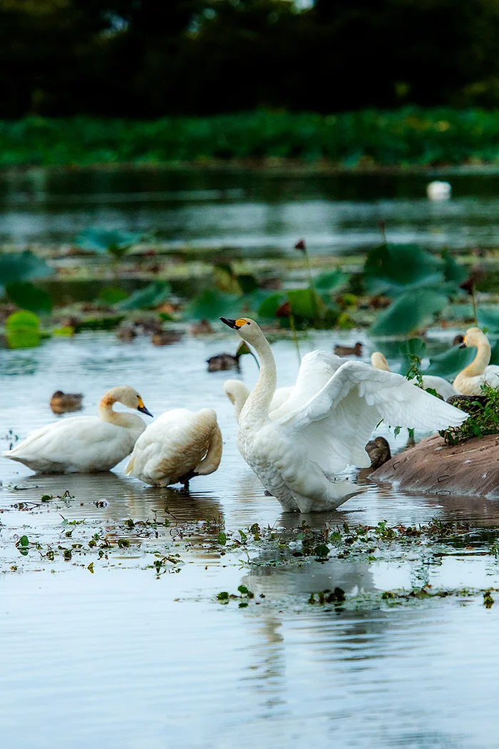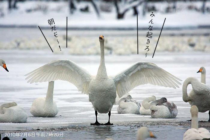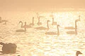 今期最高の 6451羽が、日の出とともに飛び立つ姿。瓢湖の湖面で繰り広げられる白鳥たちのファンタジー。[18枚]