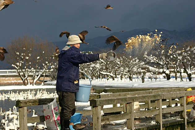 毎日、一日3回行われる瓢湖の餌付けの様子を、午後3時の餌付けに出掛けてみました。瓢湖は大騒動になります。