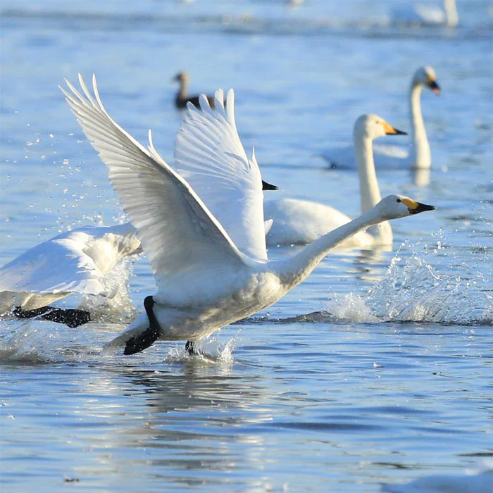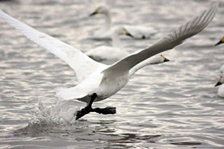 凍った湖面から飛び立つ瓢湖の白鳥の姿 貴重な瞬間です