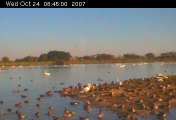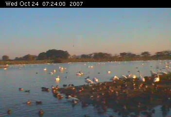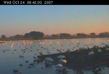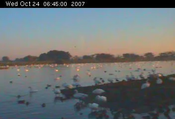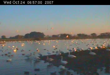 2007年10月24日 朝6時57分白鳥がエサを求めて飛び立った瞬間をライブカメラが捉えました。見えますか?画面上に5羽の白鳥が左から右へ飛んでいます。