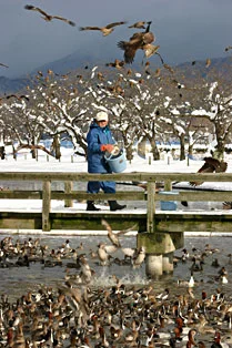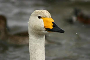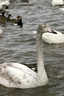 グレーの白鳥は、今年生まれたばかりの幼い白鳥です。白鳥とカモがエサに飛びついてゆく中心部から少し離れたところに、幼鳥のグループを見つけることができます。あまりの喧騒に、怯えているのでしょうか。名付けて 「白鳥の子供たちの 作戦会議」