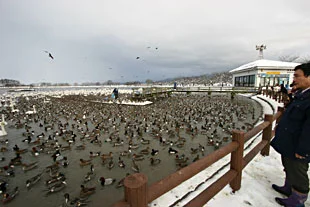 ▲午後3時 係りの人がバケツいっぱいのエサを運んできて撒き始めました