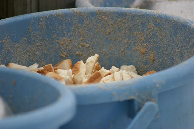 ▲初公開、これが白鳥のえさです。このバケツに入っているのは食パンのミミです。