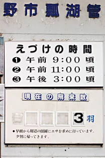 ▲今日から始まった毎朝の白鳥飛来数の案内板 記念すべき「3羽」