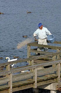 ▲今年もパンのミミをメインにしたエサを一日3回配ります