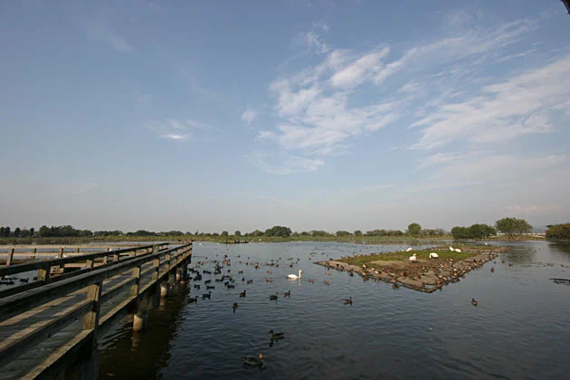 ▲湖水の中に所々ある「浮島」は、動物などに襲われないで過ごすことができる貴重な地面なのです