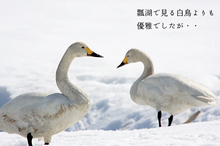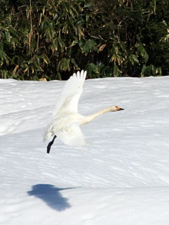 今日もやってきました。瓢湖の白鳥です。まず、2羽、そして3羽。 これが一家族。雪原に次々に着地して、水のある場所まで、ペタペタと歩いていきます。
