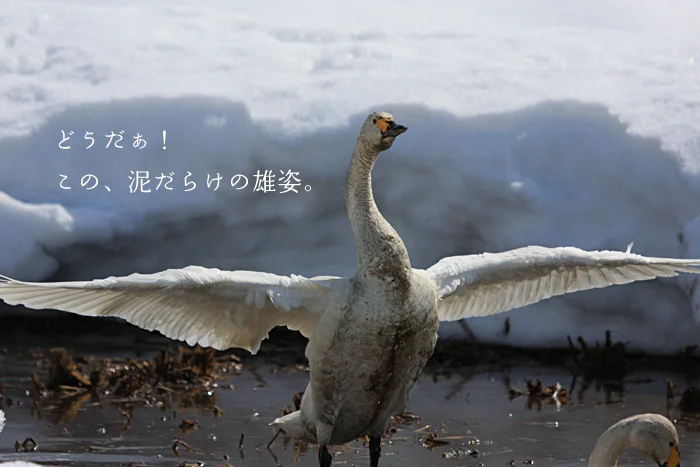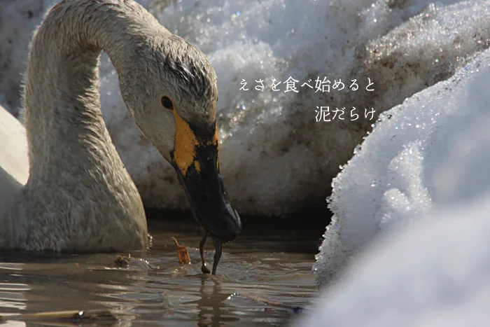 こんなに泥だらけの白鳥を見るチャンスは、なかなかありませんね。白鳥たちも必死です。シベリアへの北帰行はもうすぐ。 それまでにお腹一杯食べて、体力をつけておかなくては、4000キロの飛行をすることができません。