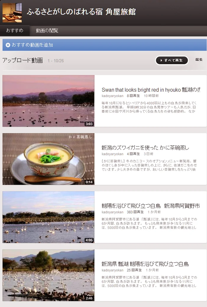 赤い白鳥毎年10月になるとシベリアから4000羽以上もの白鳥が飛来してくる新潟県瓢湖。早朝6時30分の白鳥見学ツアーも人気だが、日暮前に水田や河川から帰ってくる白鳥たちの姿も感動的。なかでも、夕焼けの美しい日は、ぜひとも午後4時頃に瓢湖を訪れたい。 夕日に染まって、真っ赤に見える白鳥たちの舞い降りる姿を見ることができる。Niigata Prefecture Hyoko swan feathers more than 4,000 have been flying from Siberia and in October of each year. But also popular tours swan at 6:30 early morning, touching the figure of a swan who came back from paddy fields and rivers before nightfall. Above all, the sunset is a beautiful day, I want to visit all means Hyoko around 4:00 pm. I can be dyed to sunset, the sight of our swan that looks bright red alight. (Google翻訳を使用しました)YouTube ムービーでご覧ください >>白鳥飛来シーズンの日の出・日の入り時刻新潟標準11月1日12月1日1月1日2月1日日の出6:126:467:006:49日の入り16:4916:2816:3417:06瓢湖の日の出6:40頃7:14頃7:28頃7:17頃