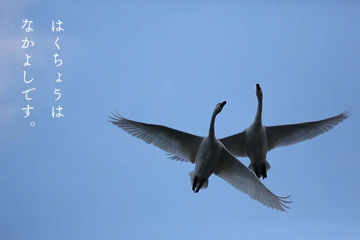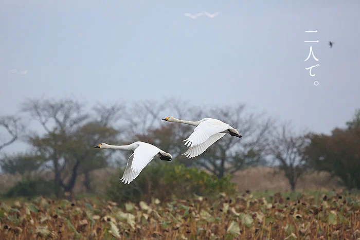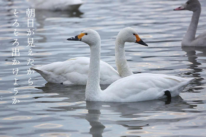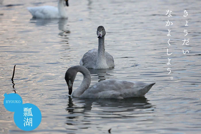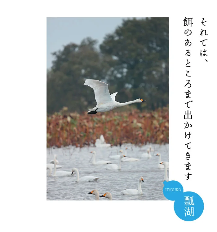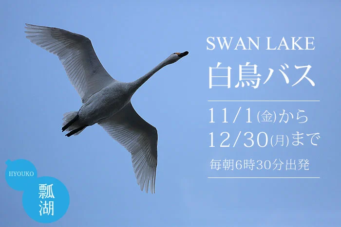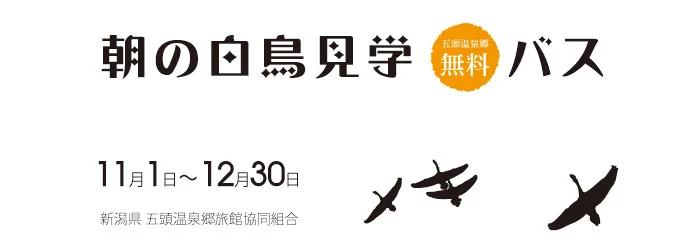 毎年恒例となりました。 今年も五頭温泉郷から朝の瓢湖へ白鳥見学バスの運行を開始しました。白鳥は必ず家族で移動します。 湖の中でも、田んぼにえさを採りに行くときも、必ず家族一緒の仲のいい鳥です。そんな目線で白鳥たちを見てみると、きっと今まで以上にオモシロく感じることでしょう。