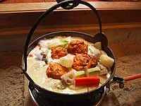 全国温泉 決死の生き残り大作戦 五頭温泉郷名物料理大作戦!◆五頭名物料理大作戦 ◆服部幸應校長 (はっとり・ゆきお)昭和20年生まれ、東京都出身、立教大学卒学校法人服部学園 服部栄養専門学校理事長・校長(5代目)昭和大学医学部博士課程在籍永禄4年(1561年)より続く服部流割烹家元の家系。明治18年(1885年)より服部式料理講習会を創立し、現在の学校法人服部学園に至る。石鍋 裕シェフ (いしなべ・ゆたか)1948年生まれ、神奈川県横浜市出身。1971年に渡仏し、「マキシム」「ヴィヴァロア」「ムーラン・ド・ムージャン」等で修業する。1976年帰国、「ビストロ・ロテュース」(東京・六本木)の料理長を経て、82年「クイーン・アリス」(東京・西麻布)を独立開店。初代・フレンチの鉄人。緑のコックコート。番組内は「フランス料理界のヴィスコンティ」と呼ばれる。記念すべき初戦「サケ対決」で丸山剛氏と対決し、見事に勝利を納める。しかし、修行のため鉄人の座を退く。五頭の醍五味鍋(だいごみなべ)命名:服部幸應校長たっぷりの野菜と飛龍頭が白い豆乳のスープに浮かぶ、見るからにヘルシーな鍋。醍五味=醍醐味(だいごみ)の語源は...「本当のよさ、真の面白さ」といった意味で使われる“醍醐味”。元々は乳製品からきた言葉だったとか。牛乳を飲むことが大陸から伝えられ、奈良時代には牛乳からヨーグルトに似た酪(らく)や、現在のバターにあたる蘇(そ)というものが、地位の高い人達に食されていたそうです。この蘇を精製したものを醍醐といいます。いわばヨーグルトのようなもの。「最高の美味」と言われ、薬用にもされていた、とても貴重な食べ物だったことから、優れた味のものを“醍醐味”というようになり、現在の意味へと変わっていったとされています。服部幸應氏が、命名に当たって、五頭名物になるように「醐」の文字を五頭温泉郷の「五」の文字に換えて、祈りを込めました。豆腐がたっぷりの飛龍頭打ち豆(大豆をつぶしたもの)豆乳(新潟県のエンレイ大豆)米どころ新潟のもち新鮮なエビとイカ絞り豆腐たっぷりの野菜くき菜(大根の葉を塩漬けしたもの)石鍋シェフ の レシピ◆鍋の材料大根 500gくき菜(大根菜) 300g打ち豆(ぶち豆) 200g椎茸(五頭椎茸) 200g里芋 500g人参 300g牛蒡 300g白菜 300g蓮根 500g長葱 1/2本切り餅(JAささかみ) 4個1/4に切る◆スープの材料鶏がらスープ 1㍑豆乳(濃いもの) 200cc五頭山麓牛乳 200cc塩・胡椒・バター◆飛龍頭の材料豆腐1丁につき烏賊(生) 100g海老 100g鳥挽肉(二度挽) 100g打ち豆 50g長芋 50g砂糖 100g醤油・塩・油◆肉団子の材料鳥挽肉 100g豚挽肉 100gくき菜みじん切り 50gおろし生姜 少々卵 1個片栗粉 適量くき菜 2~3把塩・胡椒・片栗粉・ごま油◆野菜の寸法と切り方大根 いちょう切り 厚さ1.5㌢人参 ステーキのあしらいについている切りかた 長さ5㌢で中人参1/6カット牛蒡 厚めの短冊切り 長さ5㌢平茸 乱切りもち 1個を4等分(後で揚げる)白菜 茎と葉の部分に分けて、茎幅10㌢長さ、㌢のひょうし切り葉幅2㌢長さ長さ5㌢のざく切り里芋 皮をむいて一つ物蓮根 厚さ1.5㌢のイチョウ切り長葱 厚さ3㌢の笹切り◆飛龍頭の作り方鶏肉50gを絞り豆腐の中に入れ混ぜる。残り50gは甘醤油であえ、海老・烏賊を混ぜボイル。揚げ温度はやや低め、160~170℃。◆肉団子の作り方よく混ぜて、味を調えてお湯でボイル。◆餅の揚げ方低めの油(160℃)で中身が出ないようにカラッと揚げる。私の旅館・ホテルのからだに優しい料理コンテスト五頭の醍五味鍋他2品全国温泉 決死の生き残り大作戦 五頭温泉郷名物料理大作戦!◆五頭名物料理大作戦 ◆服部幸應校長 (はっとり・ゆきお)昭和20年生まれ、東京都出身、立教大学卒学校法人服部学園 服部栄養専門学校理事長・校長(5代目)昭和大学医学部博士課程在籍永禄4年(1561年)より続く服部流割烹家元の家系。明治18年(1885年)より服部式料理講習会を創立し、現在の学校法人服部学園に至る。石鍋 裕シェフ (いしなべ・ゆたか)1948年生まれ、神奈川県横浜市出身。1971年に渡仏し、「マキシム」「ヴィヴァロア」「ムーラン・ド・ムージャン」等で修業する。1976年帰国、「ビストロ・ロテュース」(東京・六本木)の料理長を経て、82年「クイーン・アリス」(東京・西麻布)を独立開店。初代・フレンチの鉄人。緑のコックコート。番組内は「フランス料理界のヴィスコンティ」と呼ばれる。記念すべき初戦「サケ対決」で丸山剛氏と対決し、見事に勝利を納める。しかし、修行のため鉄人の座を退く。五頭の醍五味鍋(だいごみなべ)命名:服部幸應校長たっぷりの野菜と飛龍頭が白い豆乳のスープに浮かぶ、見るからにヘルシーな鍋。醍五味=醍醐味(だいごみ)の語源は...「本当のよさ、真の面白さ」といった意味で使われる“醍醐味”。元々は乳製品からきた言葉だったとか。牛乳を飲むことが大陸から伝えられ、奈良時代には牛乳からヨーグルトに似た酪(らく)や、現在のバターにあたる蘇(そ)というものが、地位の高い人達に食されていたそうです。この蘇を精製したもの