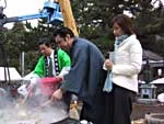 全国温泉 決死の生き残り大作戦 五頭の千人鍋大作戦!◆五頭の千人鍋大作戦 ◆原田大二郎氏 (はらだ・たいじろう)1944年 山口県生まれ 血液型 O型明治大学・法学部卒業 文学座付属演劇研究所卒業テレビ・映画・舞台での活躍は勿論、絵画展の開催の他、講演・文筆活動も盛んで、母校・明治大学の特別招聘教授として教鞭をとる等、その多彩な活動が話題を呼んでいる。今回は、2ヶ月間の舞台「悪女について」のわずかな休日を使って幾度も五頭を訪れ、協力していただきました。五頭の千人大鍋昔ながらの鉄鍋をかまどに入れました。遠くから見ても3本の杉の櫓が目をひく、たっぷり1,000人前の大鍋が完成。■ DATA ■鍋の直径 140cmかまどの高さ 1m櫓の高さ 5m総重量 ?