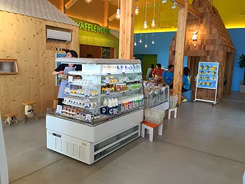 メイン施設で涼しい店内でソフトクリーム、ヨーグルト、ワッフルが食べられます。フードコート形式の店内で購入した商品を隣の「サニーテラス」でイートインできます。
