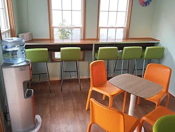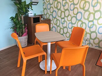 ショップで購入したソフトクリームやワッフル、ソーセージランチセットなどを、ゆっくり座って食べるスペース