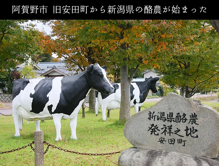 阿賀野市安田が酪農発祥の地といわれるのは、旗野美乃里(はたのみのり)が、明治31年(1898年)、当時23歳の時に、林業視察のためにヨーロッパを訪ねた際に、日本人の体格を西洋人並みにするには食生活の改革が必要、なかでも乳製品が大切と考え、帰路に経由したアメリカでカナダ産の乳牛3頭を購入してきた事によります。これを基礎にして、安田ツベタに牧場を開設したのが、新潟県の酪農の発祥です。