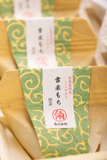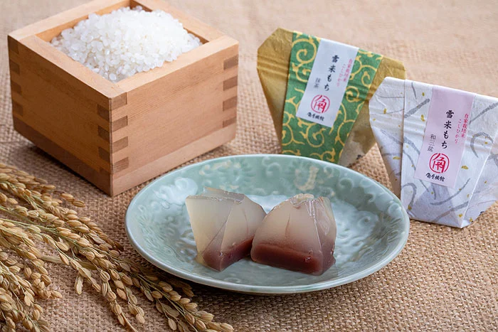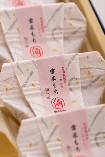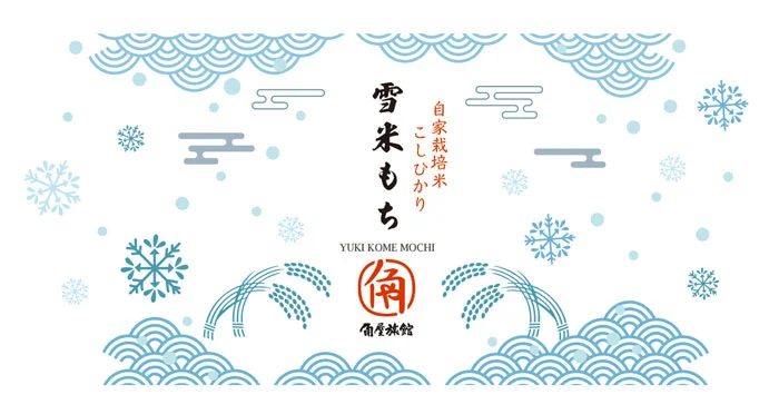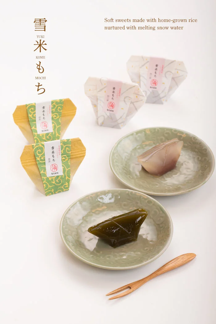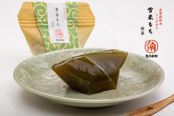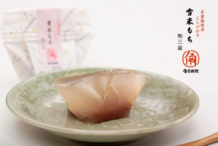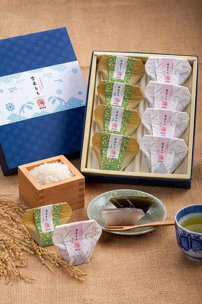 角屋旅館オリジナル和菓子雪米もちYUKIKOME MOCHI雪国新潟の霊峰五頭山から流れる豊かな名水で育てる角屋旅館の自家栽培こしひかり米。その米粉を入れた「雪米もち」は、和三盆味と抹茶味の2種類をご用意しました。寒天のようにプルンとした食感で、中には小豆こし餡が入っています。伝統と健康村杉温泉が湯治場として栄えはじめた明治・大正の頃から、角屋旅館ではお米や野菜を作り続けています。ラジウム温泉で静養するお客様の食事制限や食品アレルギーに配慮するために、小麦、乳製品を使用せず、自家栽培のコシヒカリの米粉や寒天を使用した和菓子をご用意しました。おみやげには、1箱8個入りセットで販売いたします和三盆と抹茶を4個ずつ入れて販売致しますが、組合せの変更も受付いたします。
